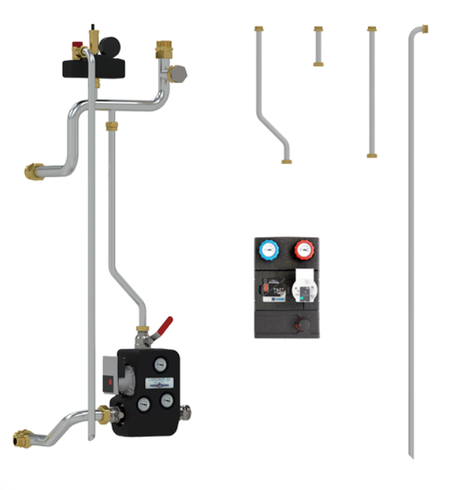 Profesionální nerezové zapojení postavené na potrubí o průměru 35 x 1,5 mm určené pro udržení minimální teploty vratné vody do kotle a rychlé připojení kotle pomocí dvou 6/4” šroubení s plochým těsněním. Zapojení obsahuje všechny potřebné komponenty, které vyžaduje výrobce – pojišťovací ventil 2,5 bar, odvzdušňovací ventil, manometr, Laddomat 22, sadu trubek pro různé varianty kotlů a nezapojenou samostatnou čerpadlovou skupinu ESBE typ GRA211 s ručně ovládaným trojcestným ventilem a čerpadlem.