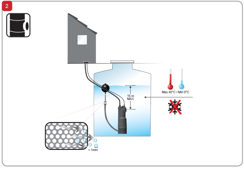 - Umístění - v zásobní nádrži s dešťovou vodou.